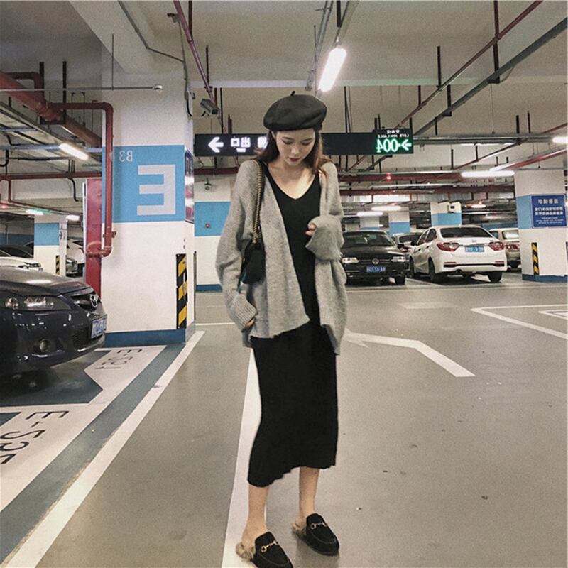色:グレーのセーター+ニットロングスカート